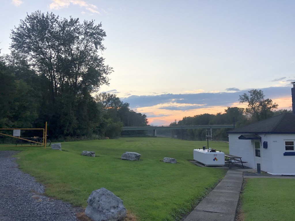 I kept working, then I moved to the lock/fire station to keep working there. You were allowed to camp for free there, so I thought that’s what I’d do. Hunker down. See if I could feel better after some deep rest. The day wore on. I got dinner in town. I felt worse and worse. I started thinking about my plans, about what missing a day of miles would mean for the whole trip, about how I would eventually get home, about meeting up with my friends in the Finger Lakes on the weekend. The sun set.