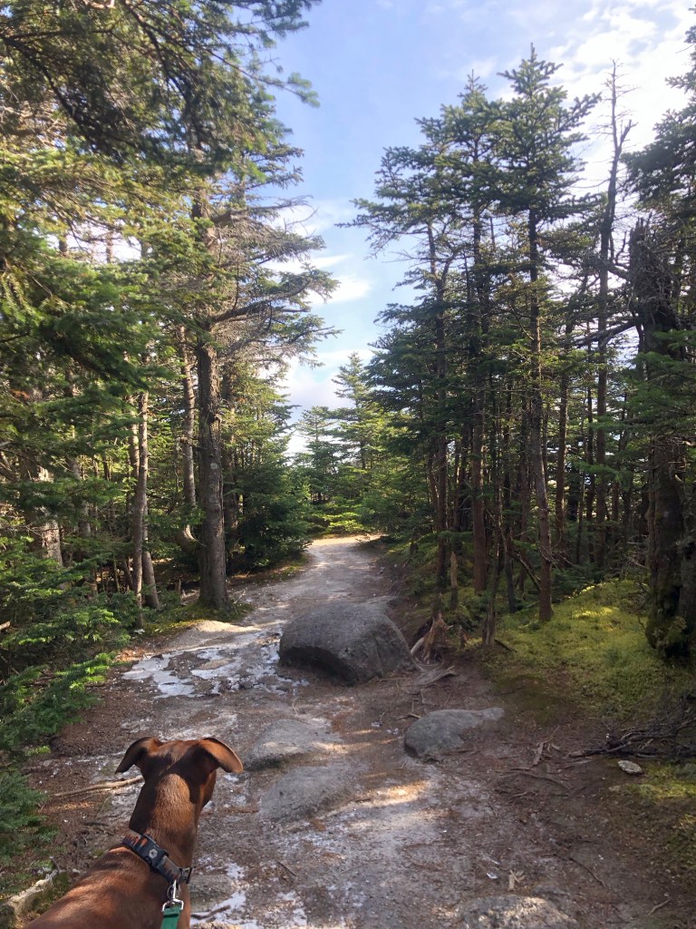 What sits between you and that peak is a deep, grooved valley. You must go straight down, and then straight back up again. There’s even a little feature called The Chimney, aptly named because it is a very brief section of trail that looks like a chimney. Though it is shaped with some steps, it does require climbing (you have to use your hands!) so I couldn’t go up or down it with the dog. There is a little roundabout trail that circumvents this and goes down some more gradual rock.